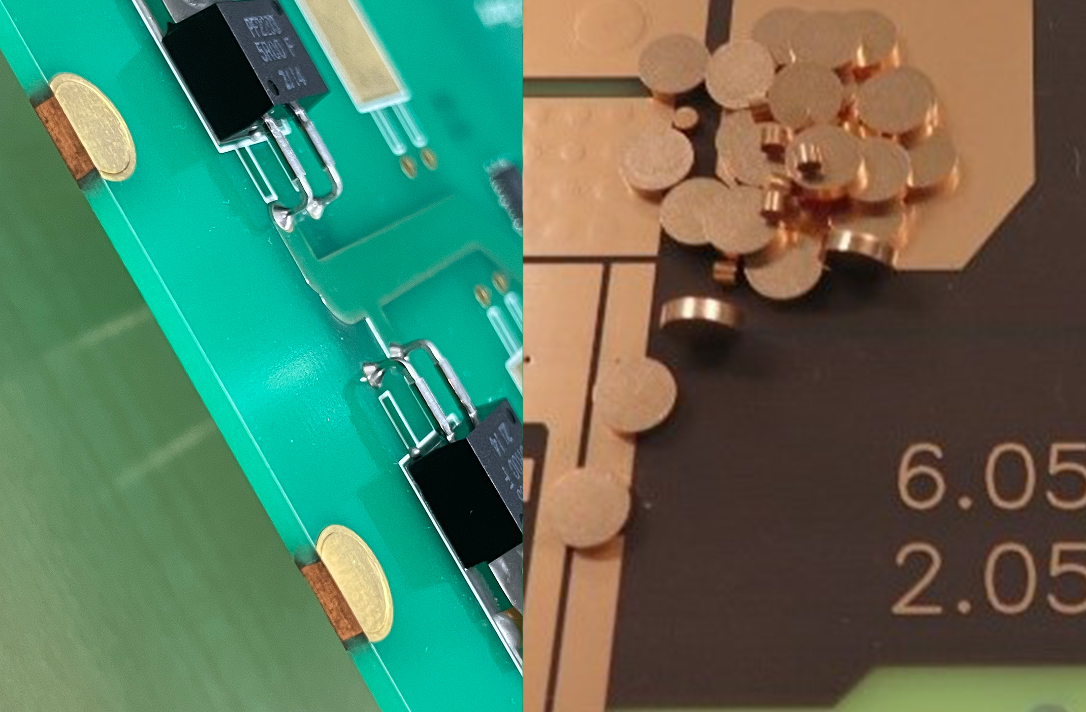基板上の発熱する部品を銅ベースに直接繋ぎヒートシンクへ放熱ができる基板です。